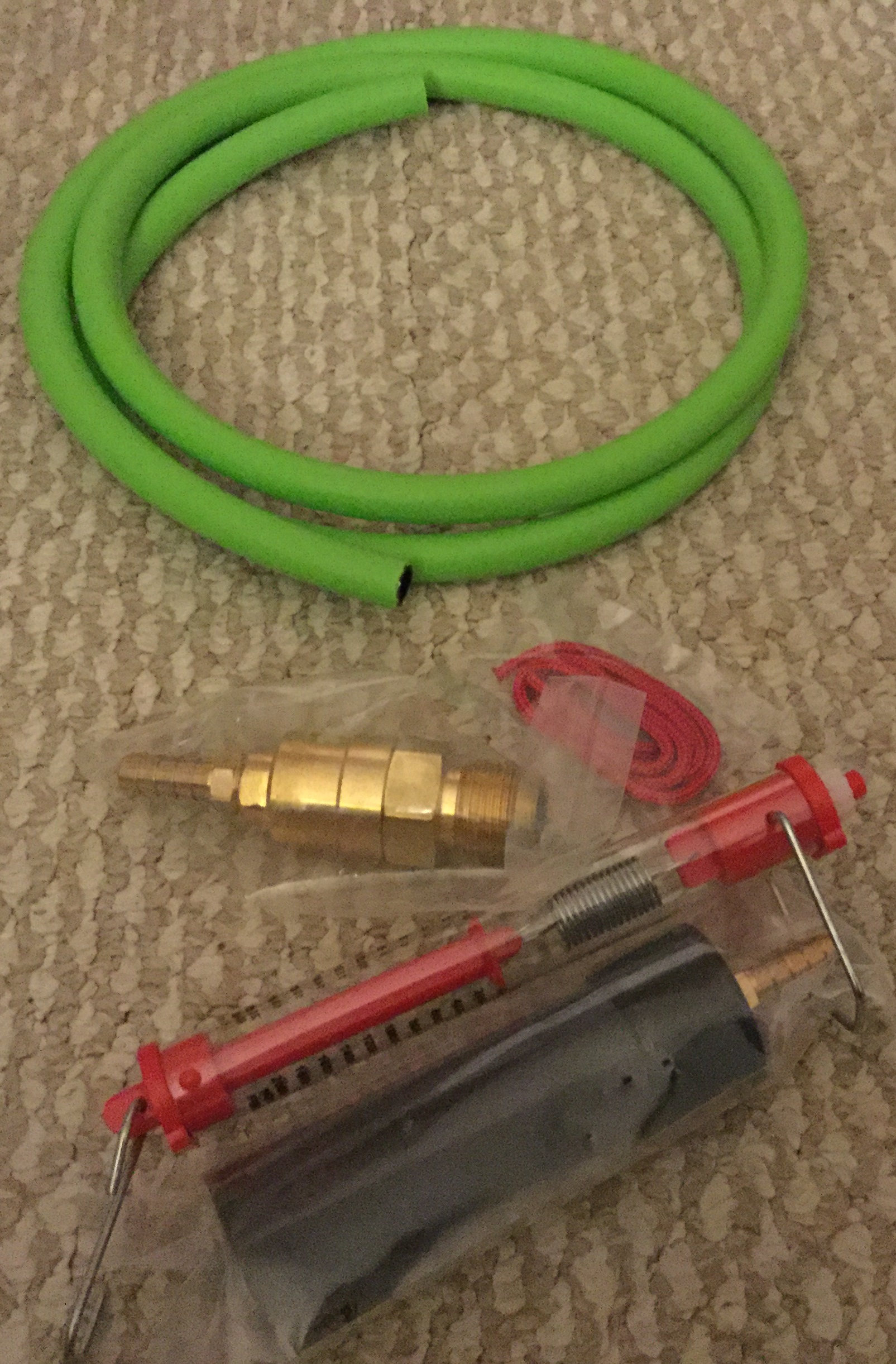 My new weather balloon inflator from High Altitude Science has just arrived. Yes, it looks like just a high-pressure hose with a CGA-580 brass fitting, but it represents a lot more. It has the weight system so we can attach weights to easily calculate our nozzle lift, and the other end is designed to snugly fit into the neck of the balloon. It also means we can safely inflate the balloon with a much higher flow rate than before.